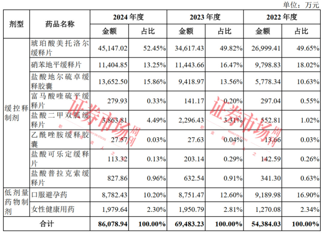 在具体产品上, 琥珀酸美托洛尔缓释片为公司核心产品,2022年度至2024年度,琥珀酸美托洛尔缓释片销售收入占制剂销售收入比例分别为49.65%、49.82%和52.45%。 其中,2023年度及2024年度,琥珀酸美托洛尔缓释片的销售收入同比分别增长28.22%和30.42%。联亚药业称,“主要系国内集采销售启动使得国内销售收入同比增加13932.74万元和8983.94万元所致。”